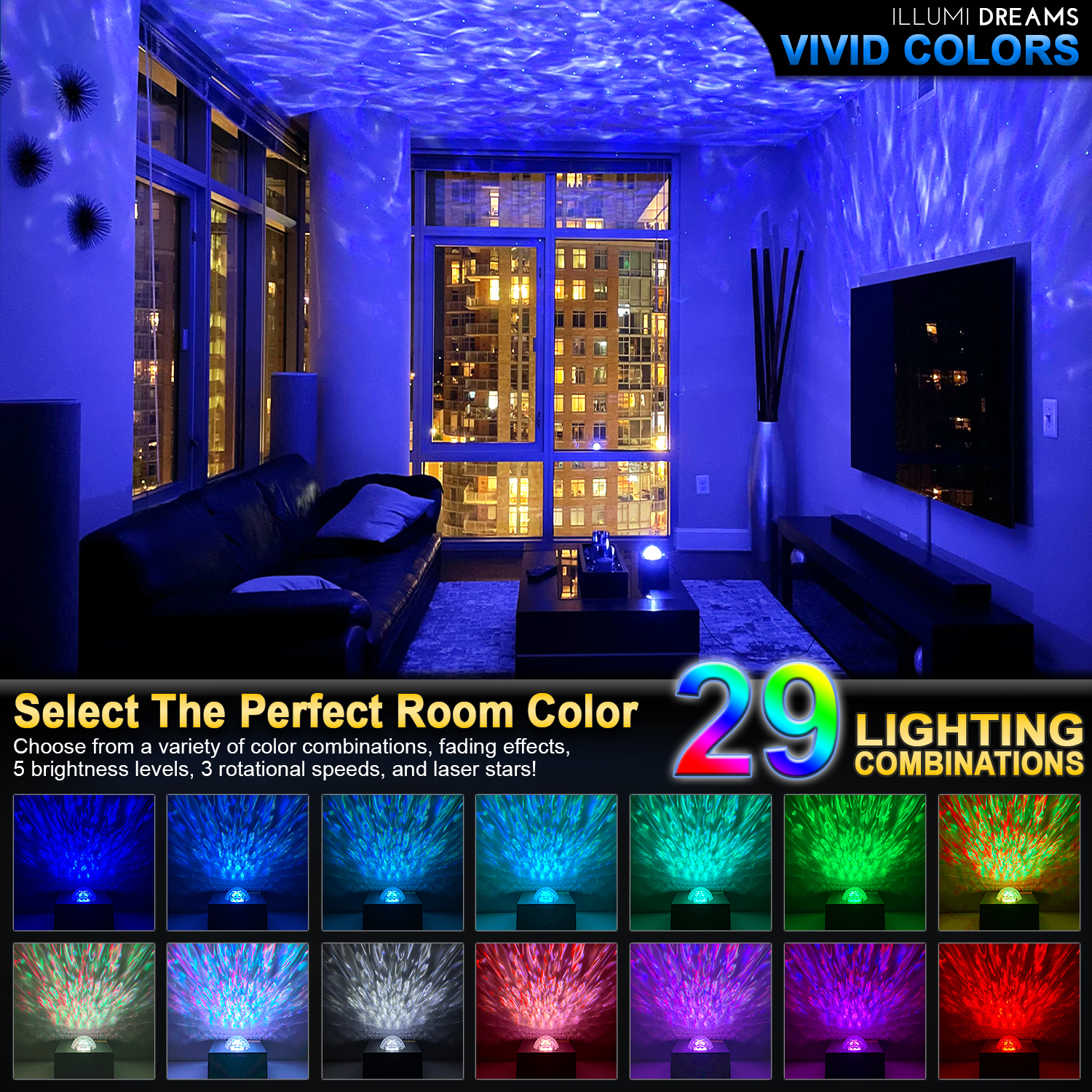 Choose from 29 lighting variations, 5 brightness levels & 3 rotational speed settings.