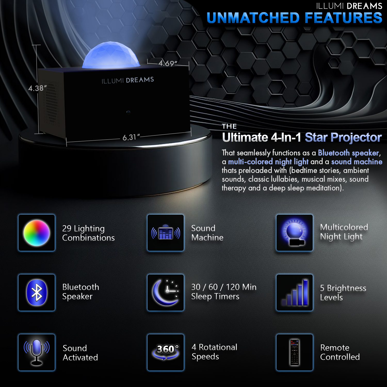 Get the most advanced multimedia star projector that will entertain everyone for hours. The 3D light show + our sleep friendly media will make bedtime fun! It also makes a great night light.